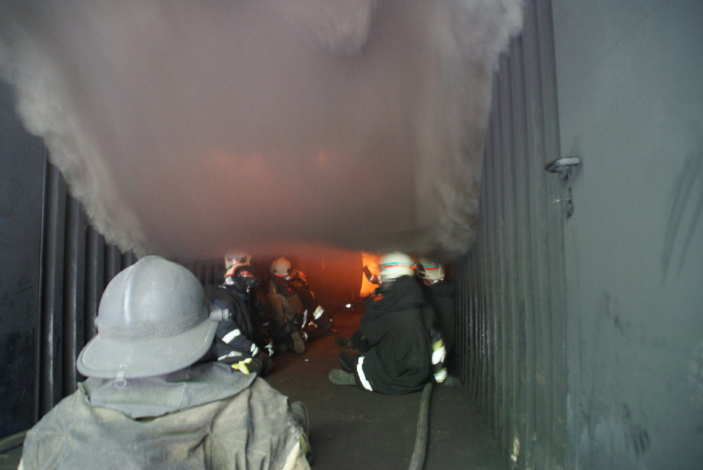 Im Vordergrund stand das richtige Anlegen der Schutzausrüstung und die entsprechende Kontrolle vor dem Eintritt in die „heisse Zone“. Wir konnten die Phasen des Entstehungsbrandes hautnah kennenlernen, die Zeichen eines brennstoff- bzw. sauerstoffkontrollierten Brandes erkennen („Rauch lesen“) , die Rauchgasdynamik beobachten, das thermische Gleichgewicht deuten und die Über- und Unterdruckzone beobachten. Bei der „Hitzegewöhnung“ konnten wir die Grenzen der Schutzkleidung hautnah spüren.