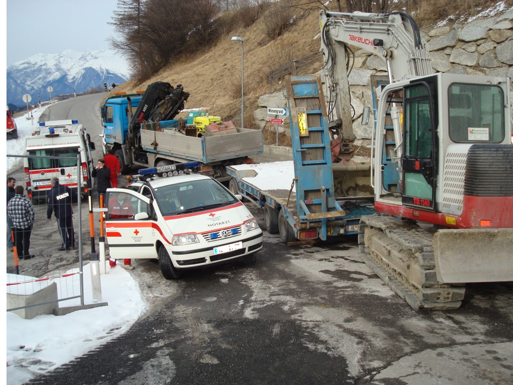 Durch einen auf der Baustelle anwesenden Bagger wurde der Tieflader sofort nach hinten weggezogen, und somit die eingeklemmte Person befreit.