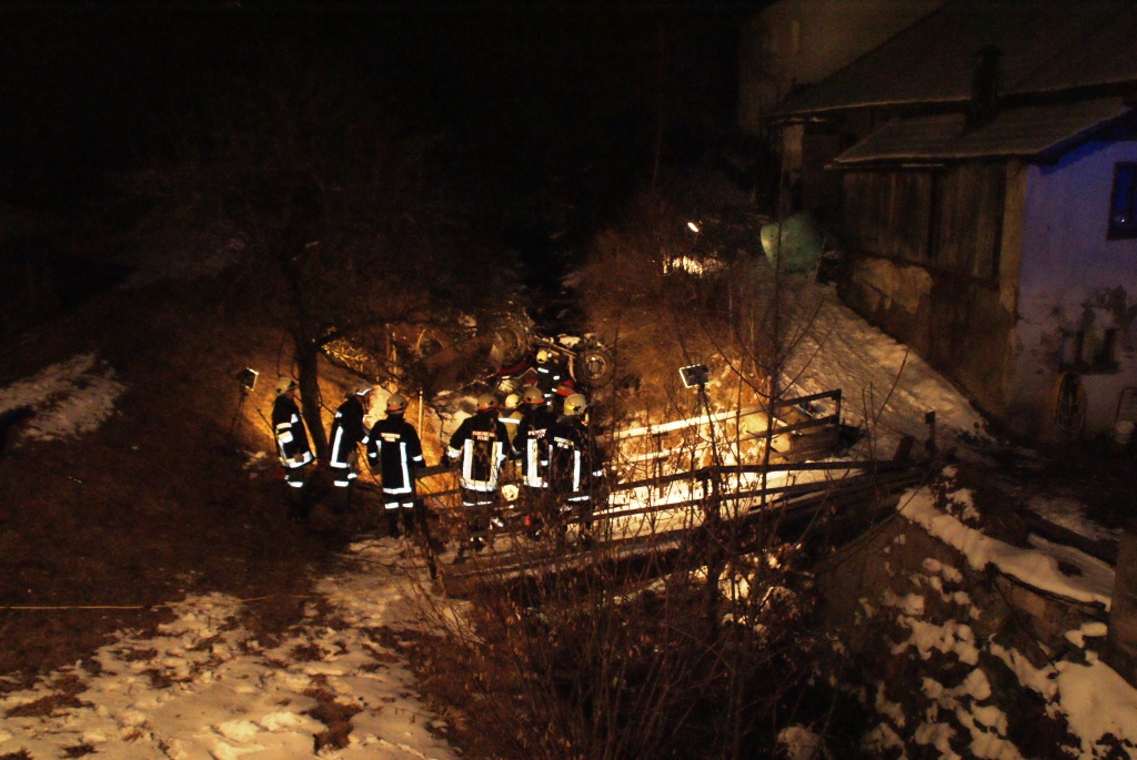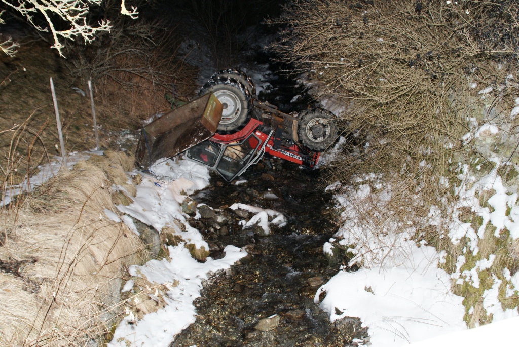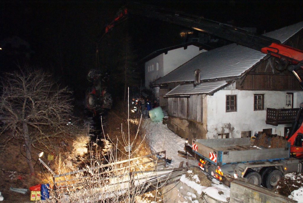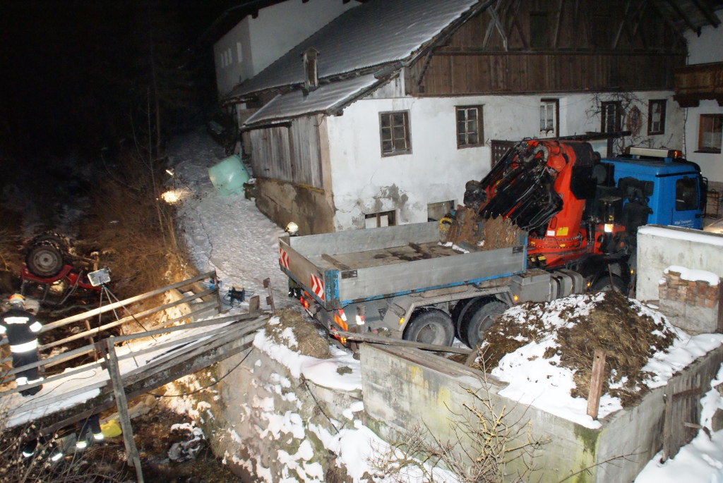 Am 26.02.2011 gegen 18:10 Uhr fuhr ein Landwirt im Ortszentrum von Pfons mit seinem Traktor nördlich seines Bauerhofes mit einem Siloballen auf der Kippmulde Richtung Tennengebäude. Auf der Tennenzufahrt lud der Bauer den Siloballen ab. Dieser rutsche auf dem schneebedeckten Untergrund ein Stück auf den Zufahrtweg. Beim Rückwärtsfahren versuchte der Lenker zwischen Siloballen und dem Bachufer auf dem schmalen, schneebedeckten Weg, mit seinem Traktor vorbeizufahren. Dabei geriet er mit dem linken Hinterrad über den Wegrand und stürzte ca. 3 m über die Ufermauer in das Bachbett und blieb auf dem Dach liegen. Der verletzte Lenker konnte sich noch selbst aus dem Wrack befreien und die Uferböschung hinaussteigen. Dort wurde er von der eintreffenden Polizeistreife übernommen.