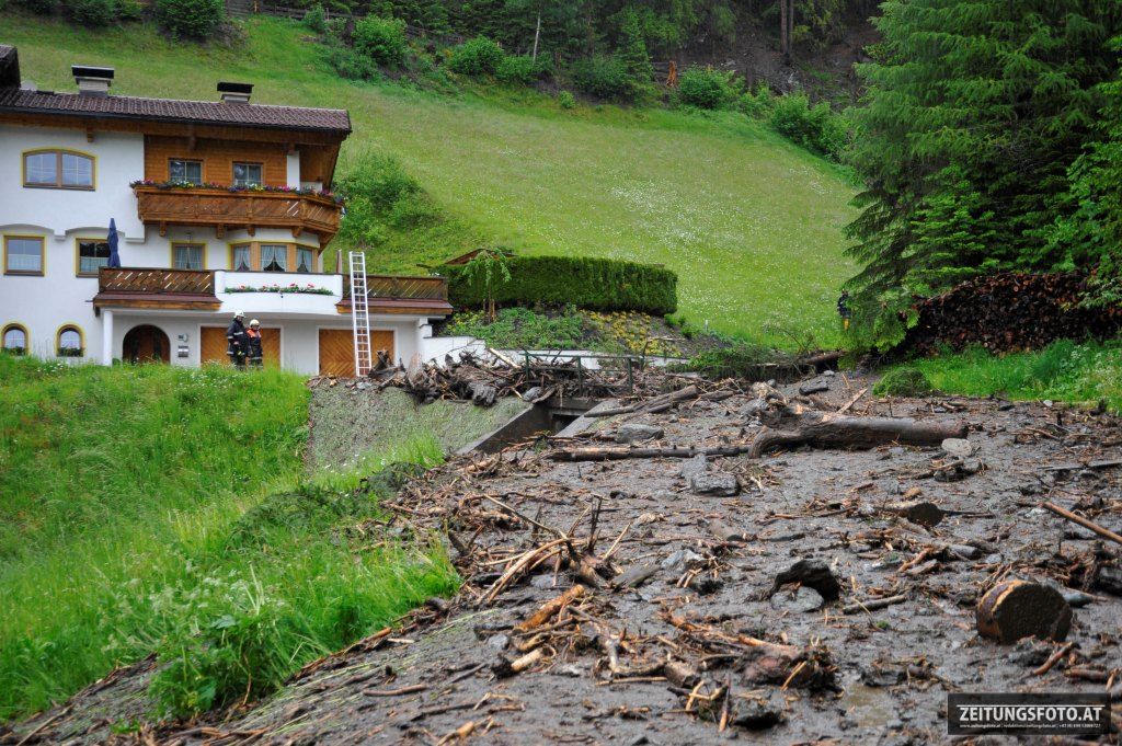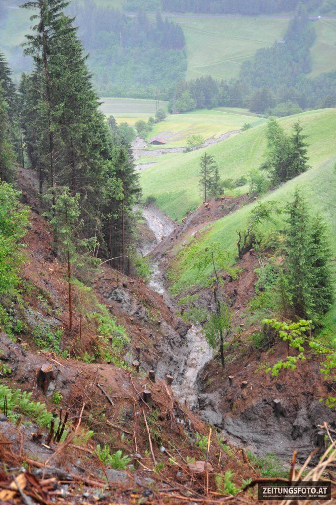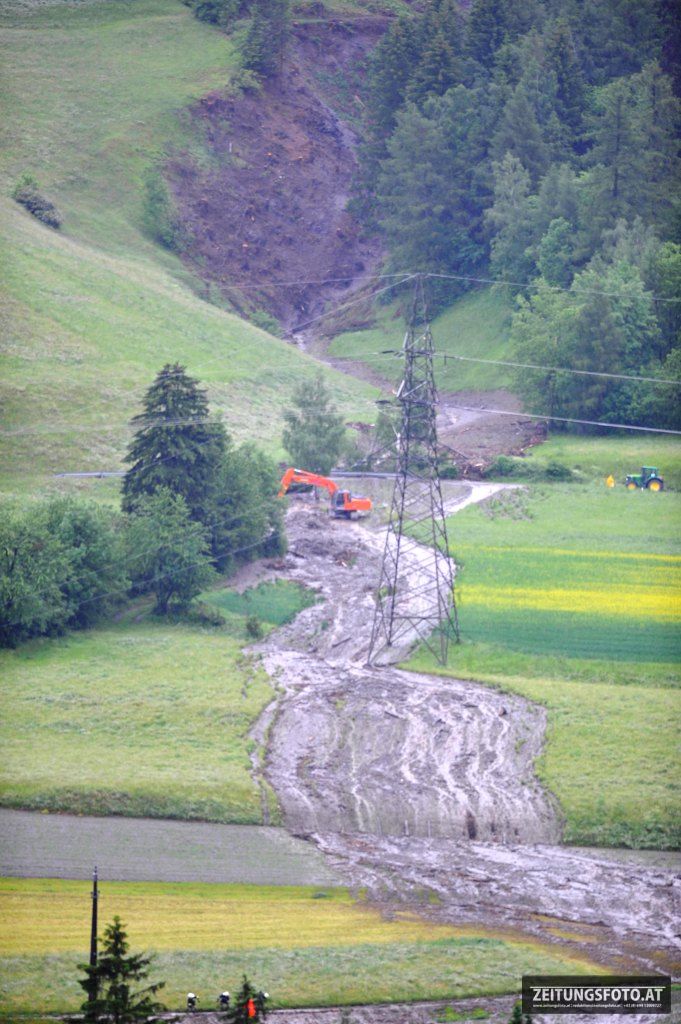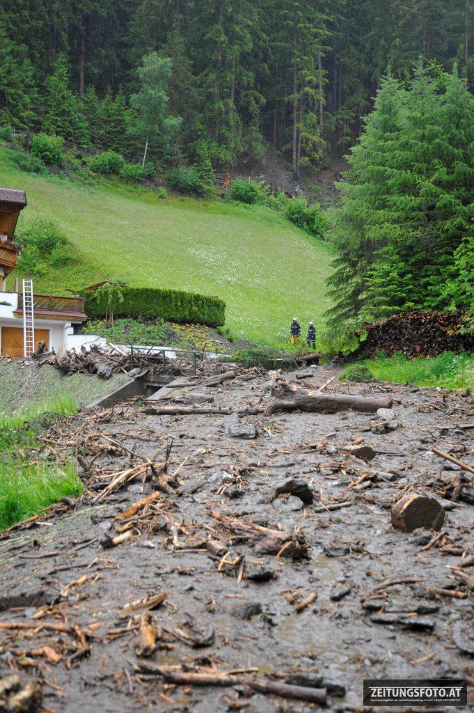Weiters wurde ein Polizeihubschrauber und ein Geologe angefordert. Einsatzleiter Toni PLANK, Bürgermeister Argen Woertz und der Geologe konnten sich per Hubschrauber die Lageerkundung von oben durchführen und sich einen Überblick verschaffen. In einer Seehöhe von ca. 1700 m in den „Geirsbichler-Lohen“ ging eine Mure (ca. 50 m breit und 150 m lang) ab und staute sich in der Folge im Bachbett des Riggelesbach. Dort staute sich das Wasser und eine Schlammlawine ging den Bachlauf entlang bis in die Pfoner-Felder nieder. Mehre Brücken wurden verklaust und auf Höhe der Ellbögener Landesstaße warf es den Bach mit dem Geschiebe aus dem Bachbett.
