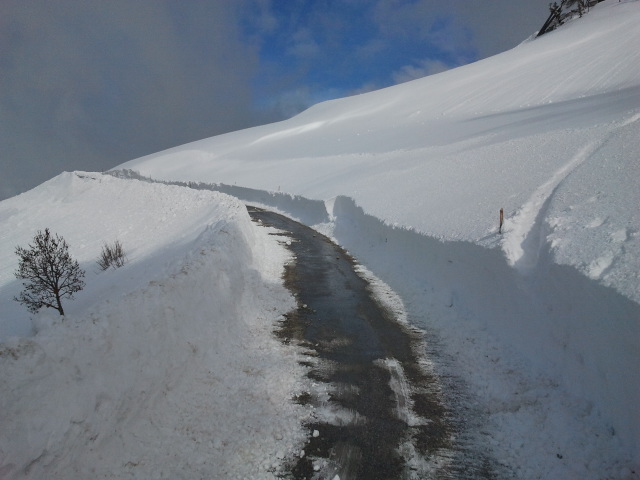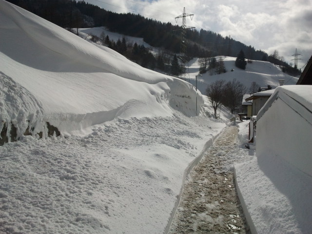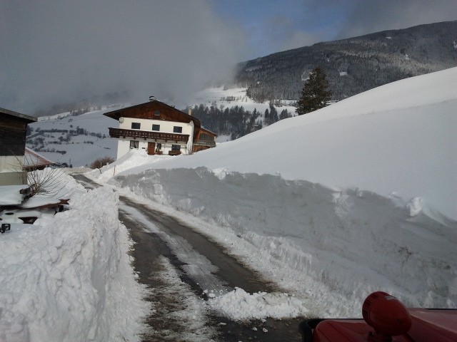 Ein weiteres Problem ergab sich im Bereich Rosiggen-Gasse. Auch dort war die Zufahrt zu den Häusern aufgrund starker Schneeverwehungen und mehrerer kleiner Schneerutsche nicht mehr möglich. Die betroffenen Anrainer informierte man ebenfals. Aufgrund der angespannten Lage entschloss man sich, erst am nächsten Morgen mit der Schneeräumung zu beginnen. Diese wurde mittels einer organisierten Schneefräse und dem Schneepflug der Gemeinde durchgeführt.